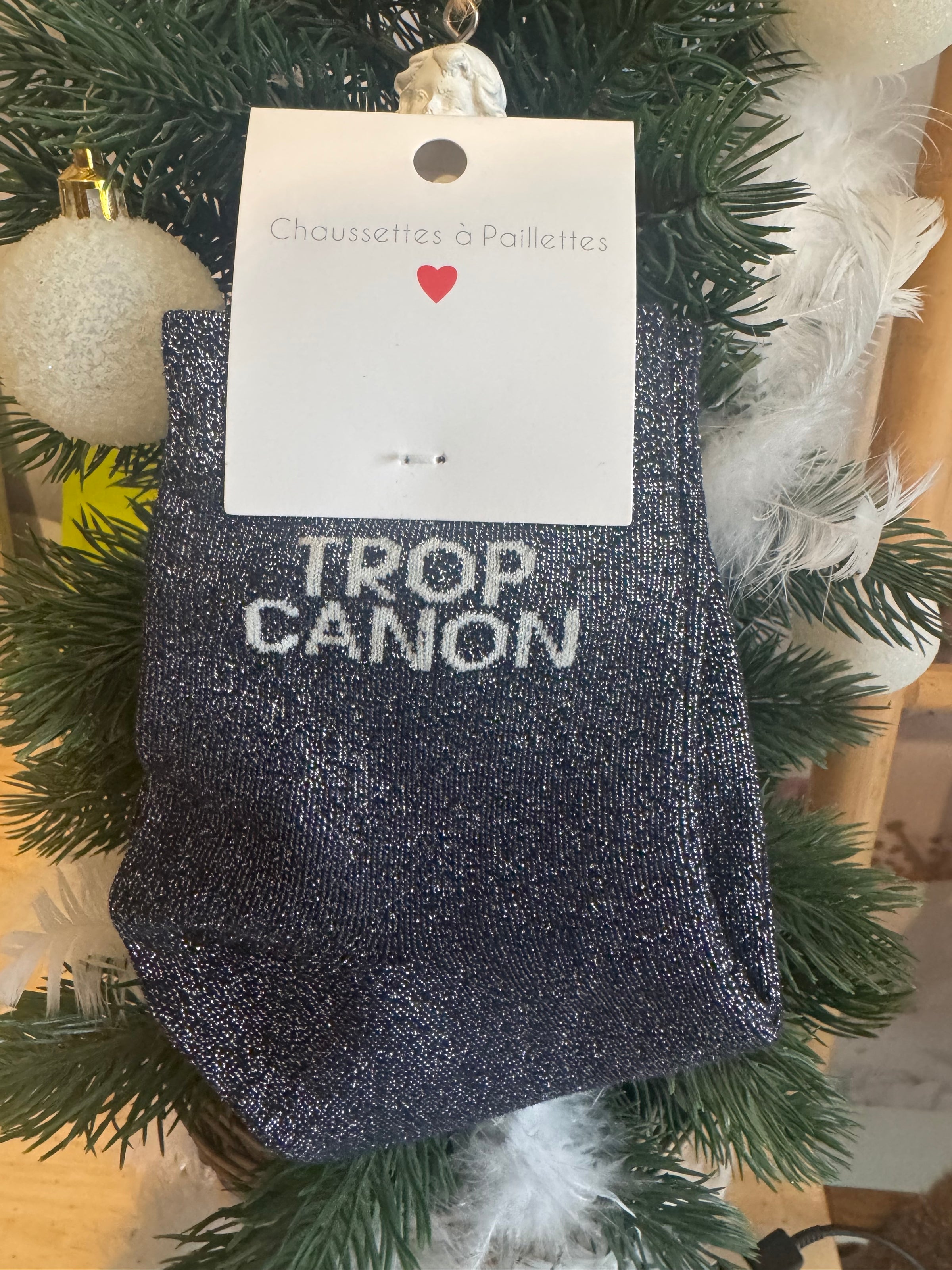 Chaussettes pailletées gris bleuté , écriture « TROP CANON » blanc