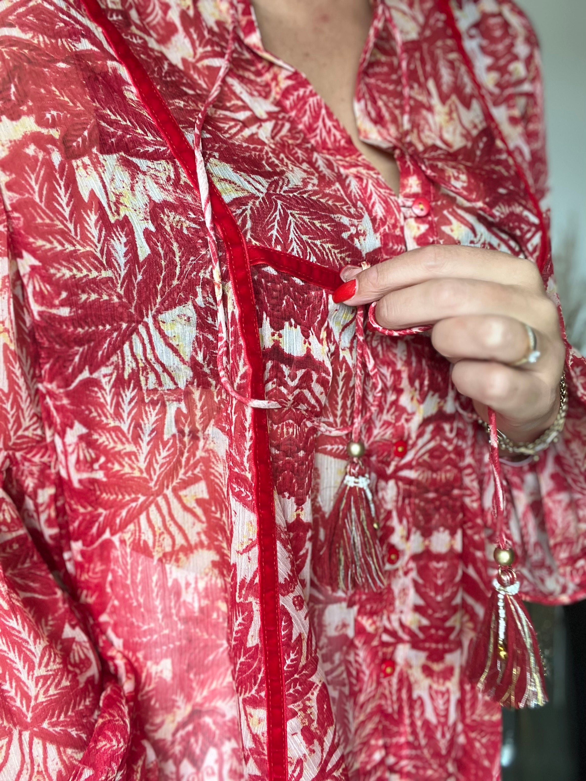 Caractéristique: Blouse à imprimé bohémien avec cordon orné de pompoms.