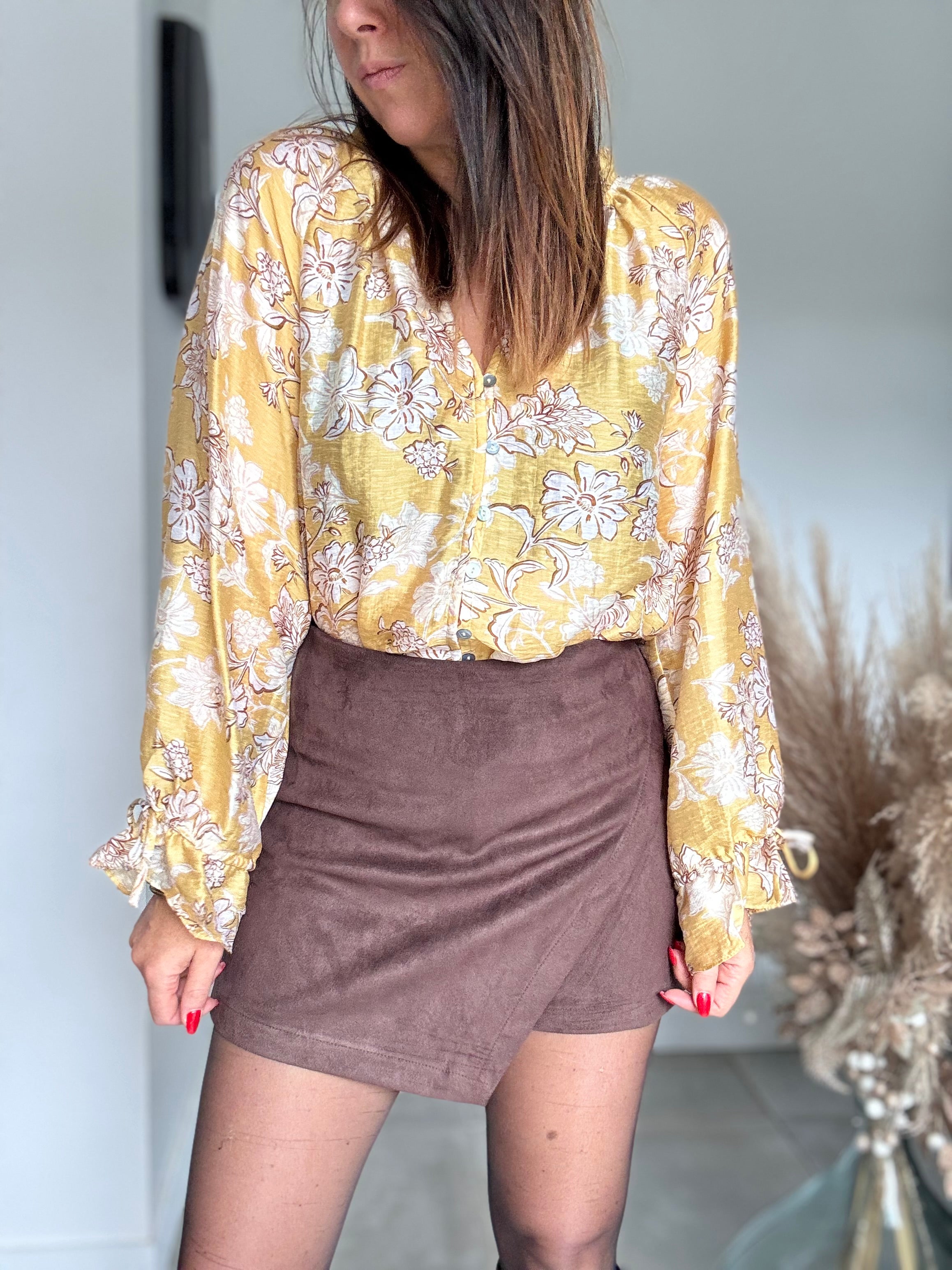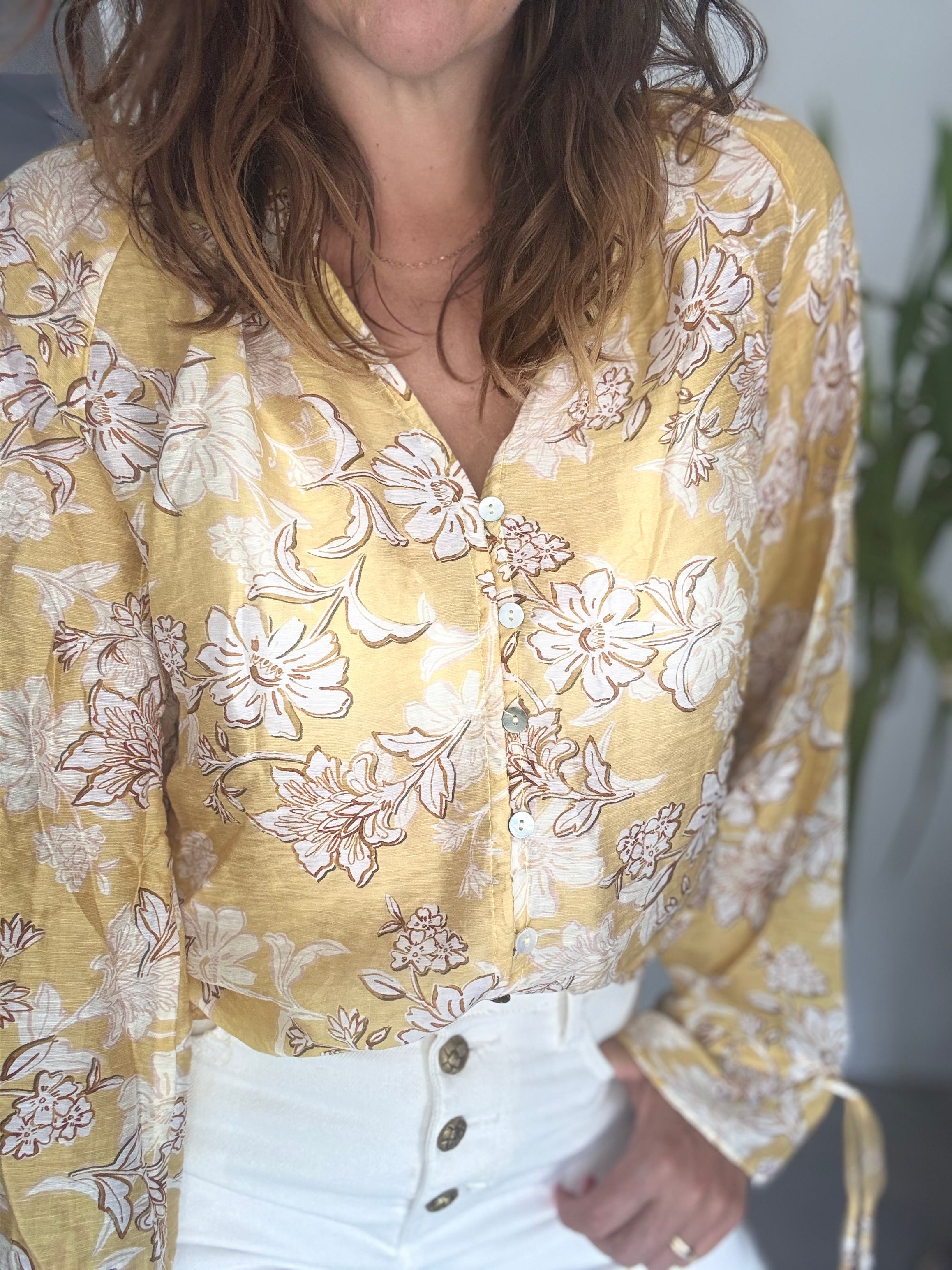 Caractéristiques: fond moutarde, motif fleuri écru, marron et rose pale. coupe droite. Manches longues évasées à nouer aux poignets. Matière très légère, fermeture boutons nacrés.