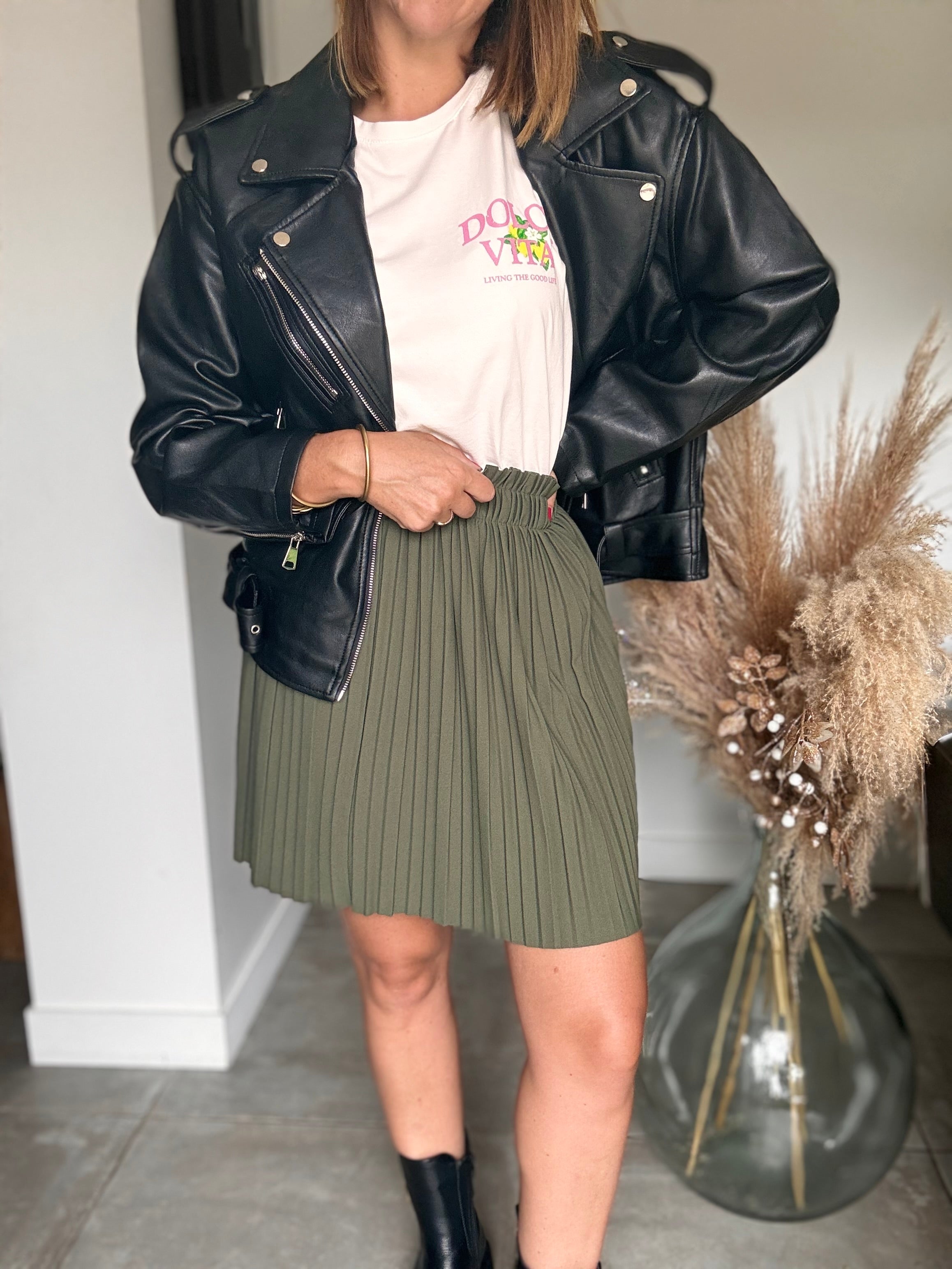 La petite jupe plissée kaki parfaite pour l’automne. Si vous le souhaitez, vous pouvez rajouter une petite ceinture au niveau de la taille, cela apportera un côté chic à votre tenue.