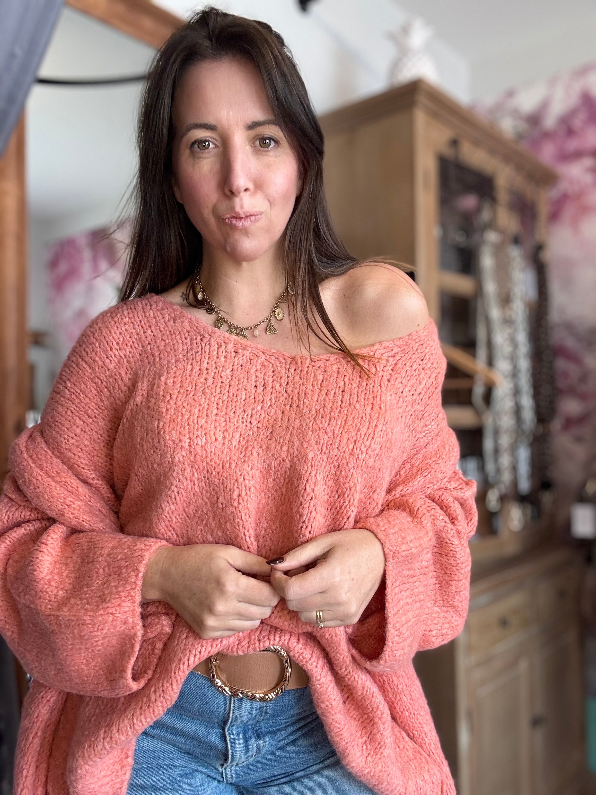 Caractéristique: col V, coupe loose, couleur saumon